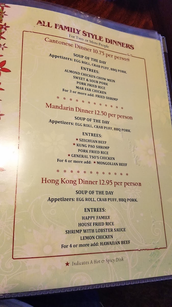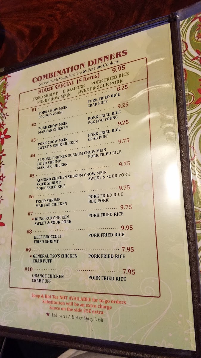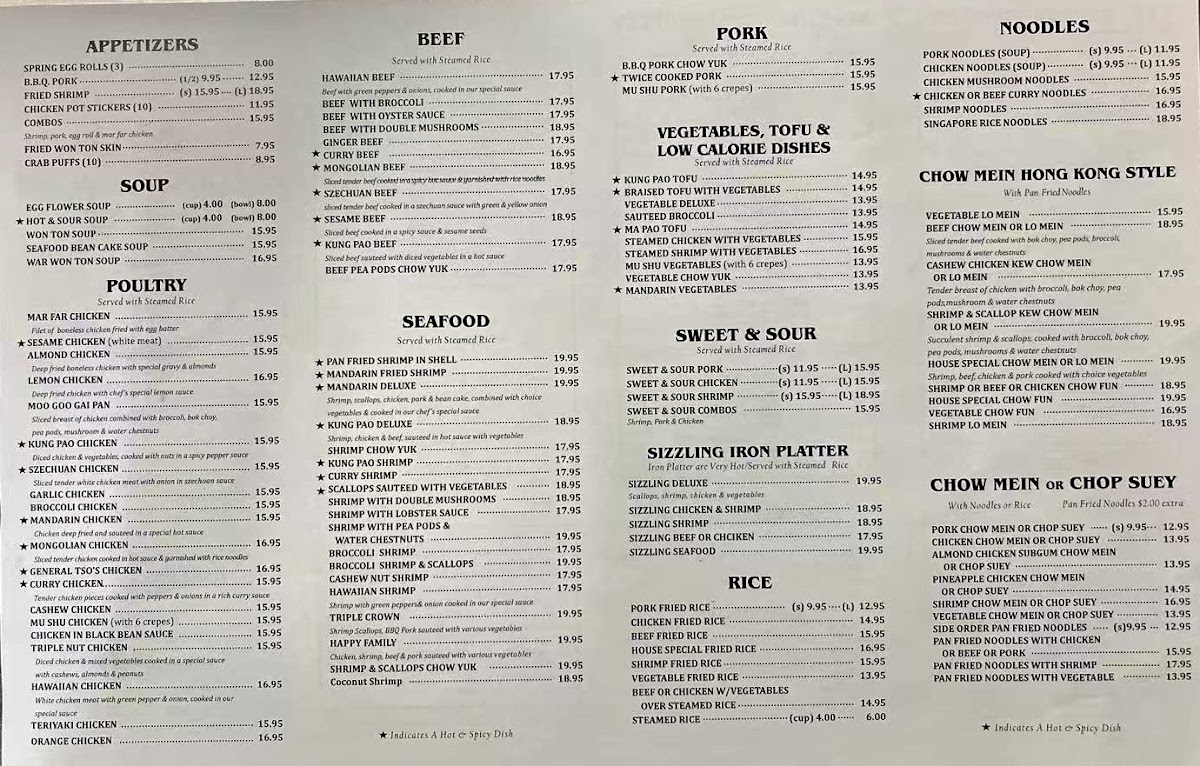Chen's Happy Garden offers a straightforward, comforting menu that reflects its classic Chinese restaurant roots. The selection features familiar dishes that fit well for both a casual lunch break and a relaxed evening meal. Patrons can enjoy hearty plates like crab puffs, hot and sour soup, and shrimp & scallop kew chow mein, alongside satisfying combos such as sweet and sour chicken or chicken BBQ pork.